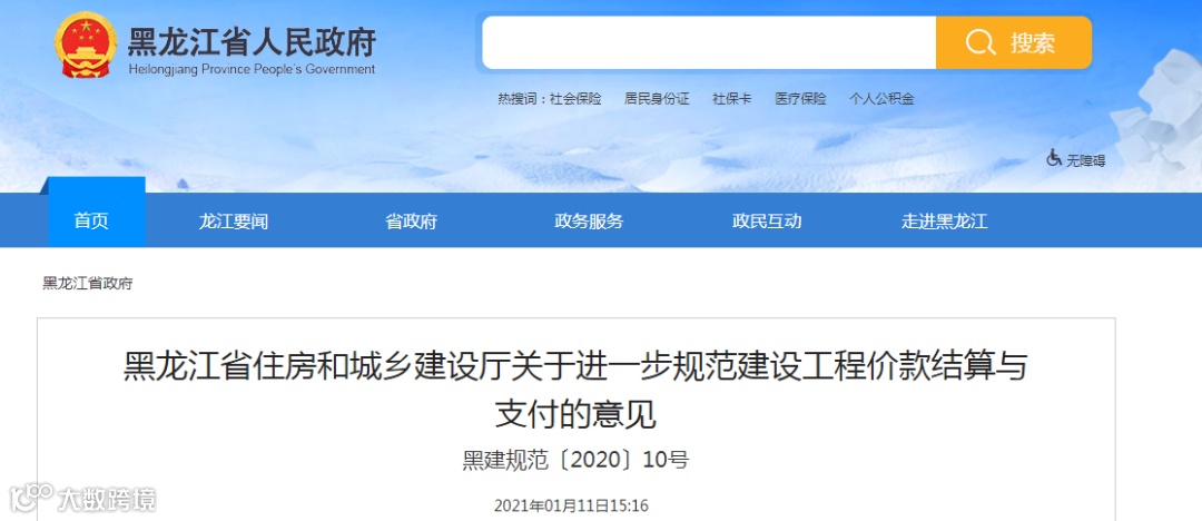 2020年11月12日,黑龙江省住房和城乡建设厅发布《关于进一步规范建设工程价款结算与支付的意见》。