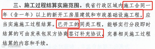1、适用范围:合同工期一年以上(含本数)的各类房屋建筑及其附属设施的建造、装修装饰和与其配套的线路、管道、设备的安装以及市政基础设施工程,实施施工过程结算。