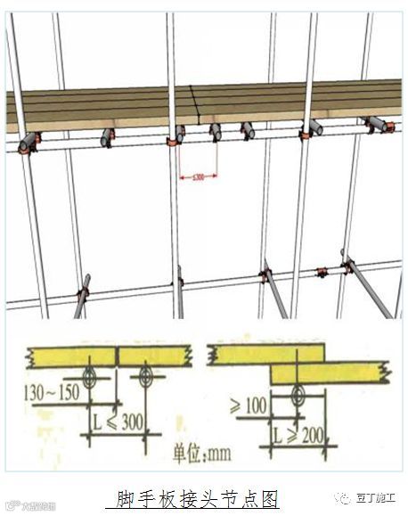 (3)脚手板的铺设应采用对接平铺或搭接铺设;脚手板对接平铺时,接头处应设两根横向水平杆,脚手板外伸长度应取130mm -150mm,两块脚手板外伸长度的和不应大于300mm;脚手板搭接铺设时,接头应支在横向水平杆上,搭接长度不应小于200mm,其伸出横向水平杆的长度不应小于100mm。