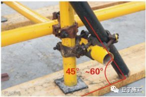 (4)每道剪刀撑宽度不应小于4跨,且不应小于6m,斜杆与地面的倾角应在450--600之间。