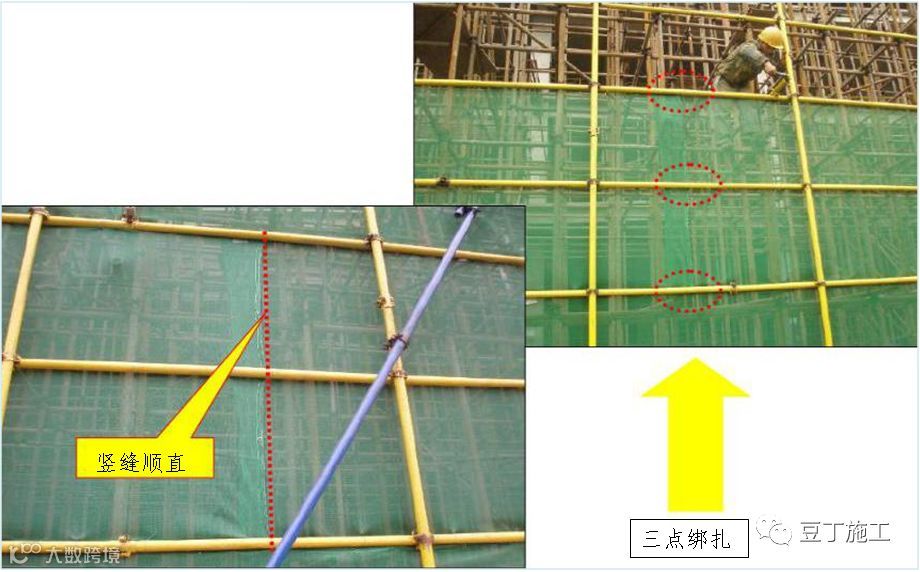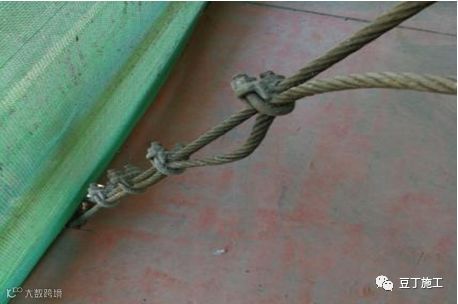 质量控制要点:密目式安全网搭时,每个开眼环口应穿入系绳,系绳应绑扎在支撑架上,间距不得大于450mm。