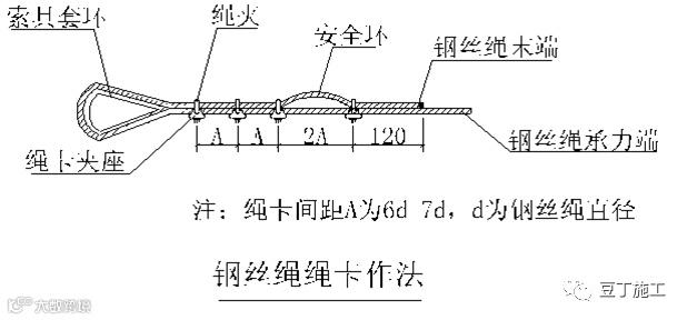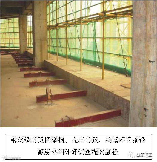 10.挑钢梁前端应采用吊拉卸荷,吊拉卸荷的吊拉构件有刚性的,也有柔性的,如果使用钢丝绳,其直径不应小于14㎜,使用预埋吊环其直径不宜小于20㎜(或计算确定)。钢丝绳卡不得少于3个。