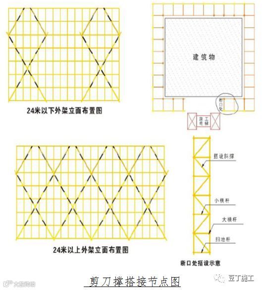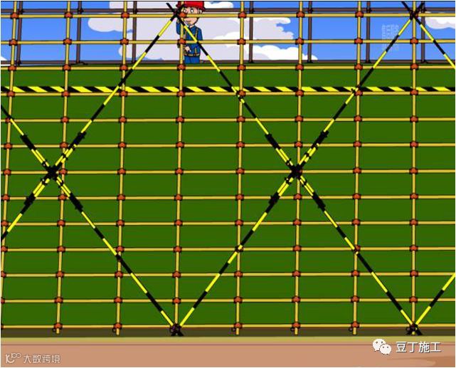(3)开口型双排脚手架的两端均必须设置横向斜撑,横向斜撑应在同一节间,由底至顶层呈之字形连续布置。