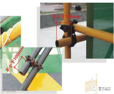 ⑤当立杆采用搭接接长时,搭接长度不应小于1m,并应采用不少于2个旋转扣件固定;端部扣件盖板的边缘至杆端距离不应小于100mm。