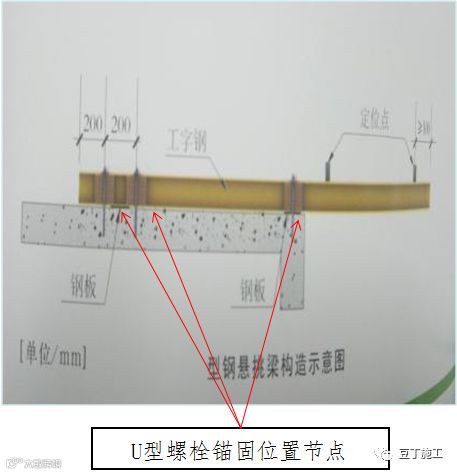 2.型钢悬挑梁宜采用双轴对称截面的型钢。悬挑钢梁型号及锚固件应按设计确定,钢梁截面高度不应小于160mm。悬挑梁尾端应在两处及以上固定于钢筋混凝土梁板结构上。锚固型钢悬挑梁的U型钢筋拉环或锚固螺栓直径不宜小于16㎜。