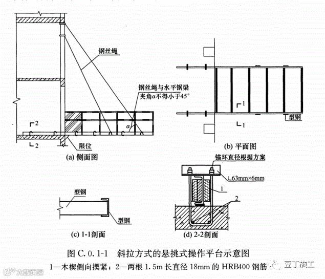 3.斜拉方式的悬挑操作平台,平台两侧的连接吊环应与前后两道斜拉钢丝绳连接,每一道钢丝绳应能承载该侧所有荷载。