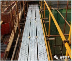 (2)冲压脚手板、木脚手板、竹串片脚手板等,应设置在三根横向水平杆上。当脚手板长度小于2m时,可采用两根横向水平杆支撑,但应将脚手板两端与横向水平杆可靠固定,严禁倾翻。