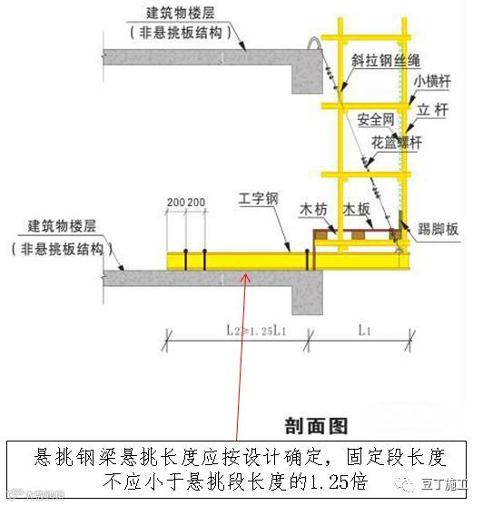 (1)每个型钢悬挑梁外端宜设置钢丝绳或钢拉杆与上一层建筑结构斜拉结。钢丝绳、钢拉杆不参与悬挑钢梁受力计算。