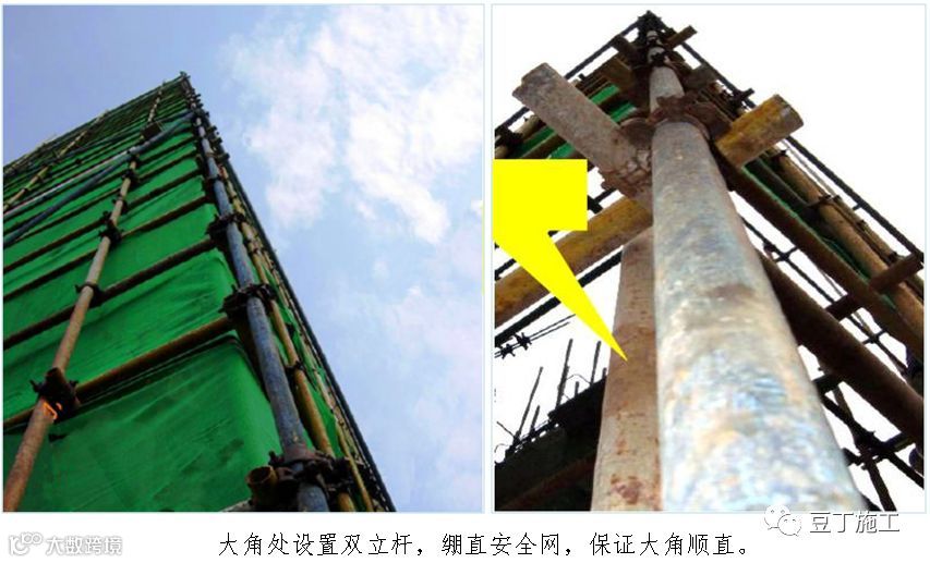 1.上下层外架的转角立杆,在布置槽钢时应特别注意将型钢上的钢管定位桩与下一层架子的立杆定位在同一铅垂线上,确保大角正直。