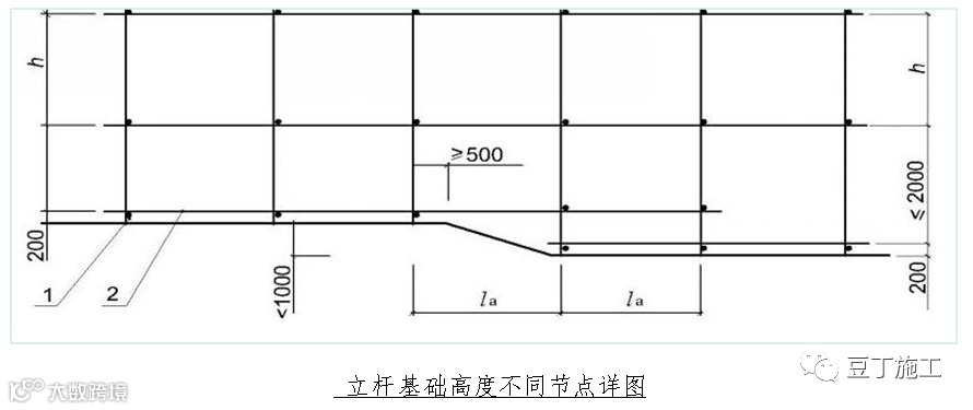②脚手架立杆基础不在同一高度上时,必须将高处的纵向扫地杆向低处延长两跨与立杆固定,高低差不应大于1m。靠边坡上方的立杆轴线到边坡的距离不应小于500mm。