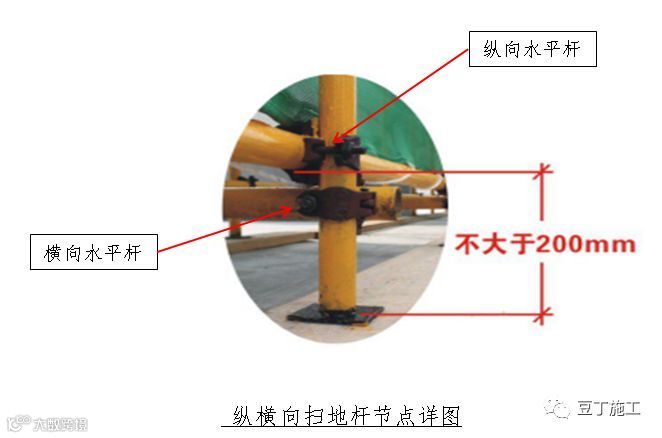 ①脚手架必须设置纵、横向扫地杆。纵向扫地杆应采用直角扣件固定在距钢管底端不大于200mm处的立杆上。横向扫地杆应采用直角扣件固定在紧靠纵向扫地杆下方的立杆上。