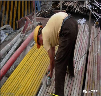 (2)全数目测检查钢管表观质量缺陷,表面应平直光滑、不应有裂缝、结疤、分层、错位、硬弯、毛刺、压痕、严重腐蚀等缺陷,严禁钢管打孔;钢管使用前必须刷防锈漆。