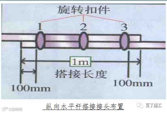 ②纵向水平杆的搭接长度不应小于1m,应等间距设置3个旋转扣件固定;端部扣件盖板边缘至搭接纵向水平杆杆端的距离不应小于100mm。
