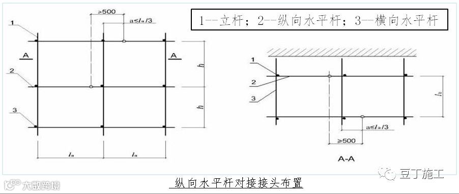 ①两根相邻纵向水平杆的接头不应设置在同步或同跨内;不同步或不同跨两个相邻接头在水平方向错开的距离不应小于500mm;各接头中心至最近主节点的距离不应大于纵距的1/3。