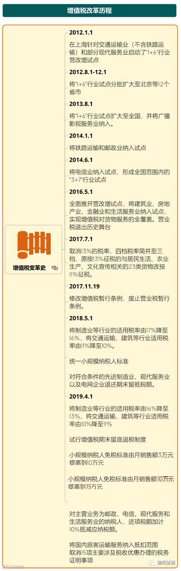 10月1日起,增值税(5%→1.5%)+房产税又有新政策执行,如何应对即将执行的新政?增值税要立法了,最新立法进程到哪儿了?一起看看增值税的改革历程。建管君文末还整理有最新的增值税税率表以及进项抵扣、加计抵减、留抵退税、预缴税款、增值税减免及不征税项目等相关政策,建议收藏备用。