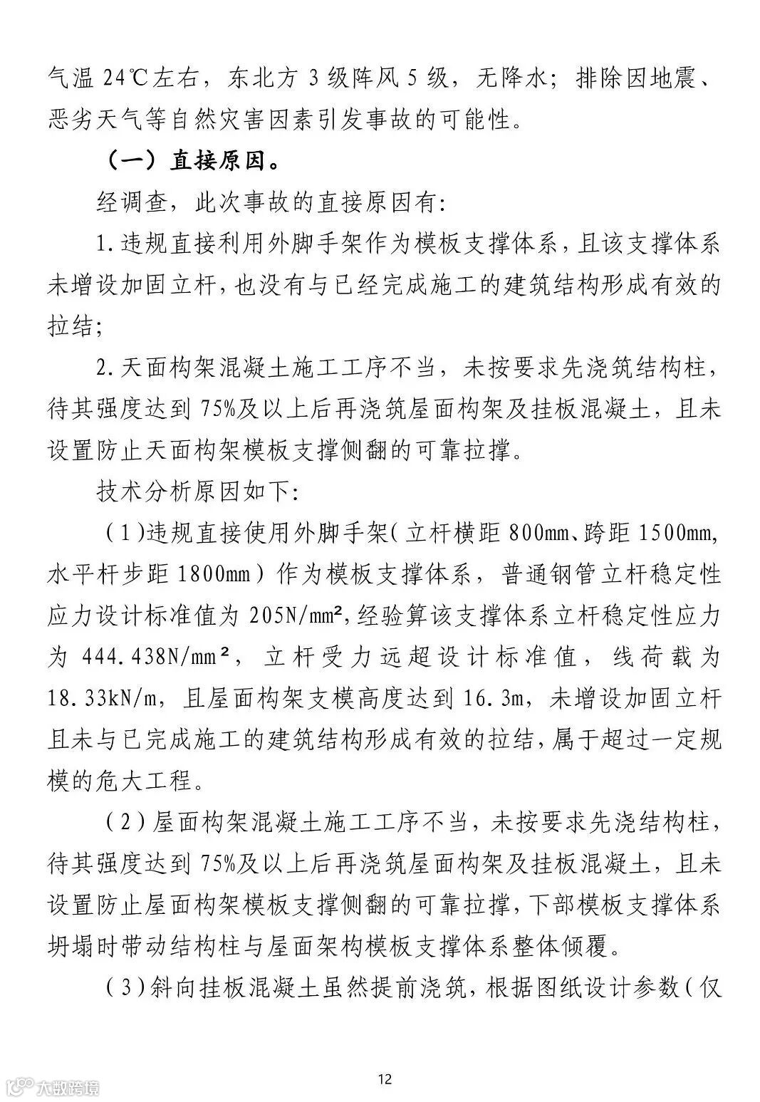 2、天面构架混凝土施工工序不当,未按要求先浇筑结构柱,待其强度达到75%及以上后再浇筑屋面构架及挂板混凝土,且未设置防止天面构架模板支撑侧翻的可靠拉撑。