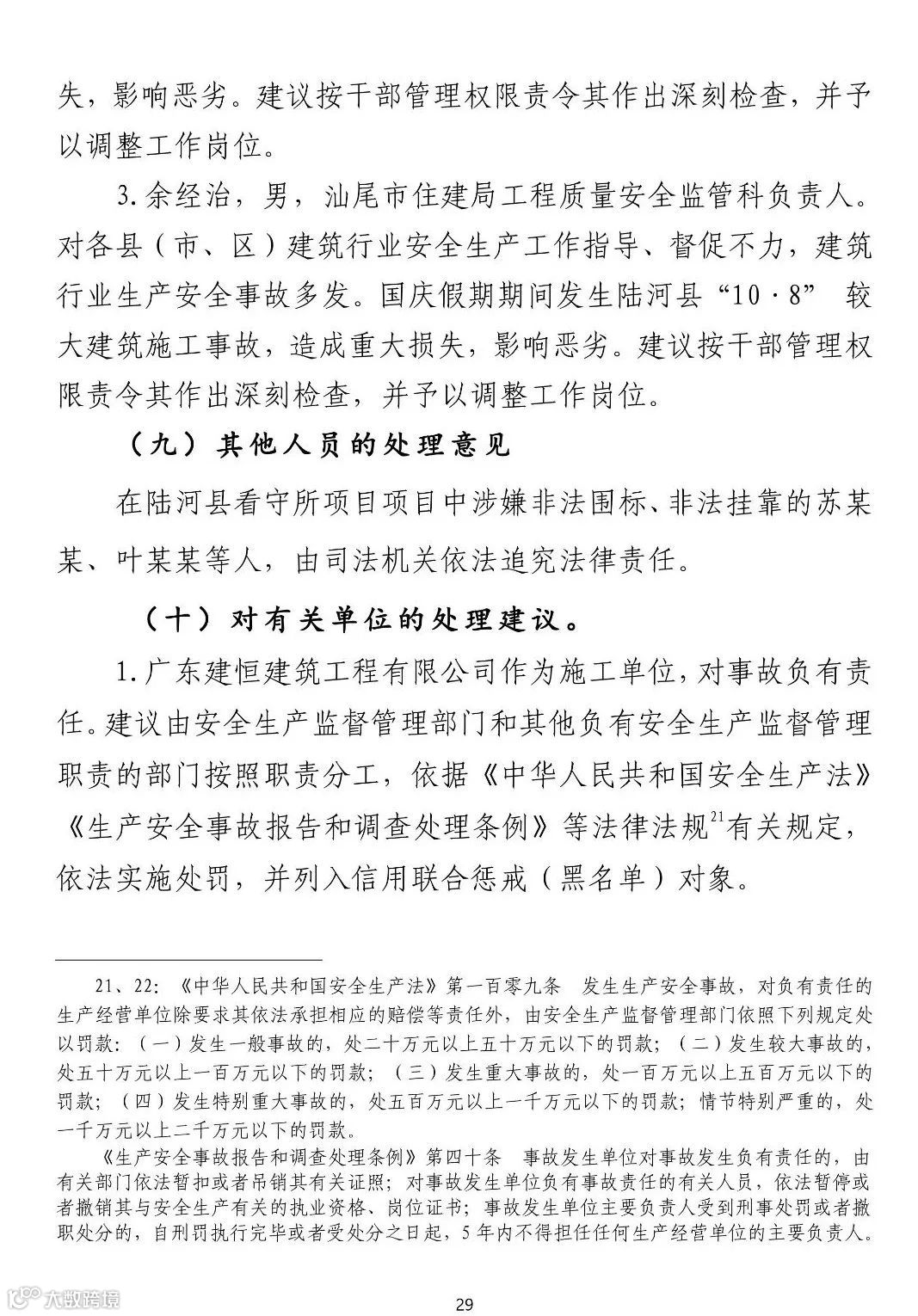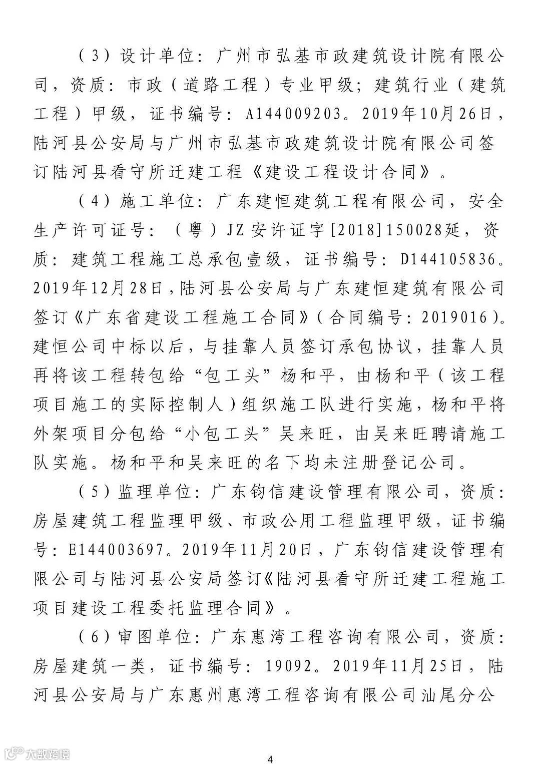 4.丘某艳,男,“包工头”杨某平聘请的陆河看守所项目施工安全员,没有持证上岗。建议由司法机关依法追究其法律责任(2020 年11月17日被汕尾市检察院批准逮捕)。