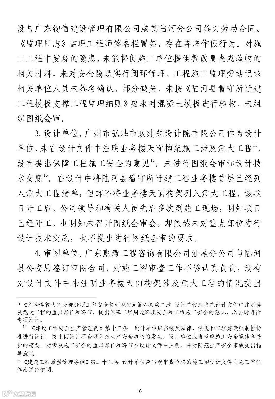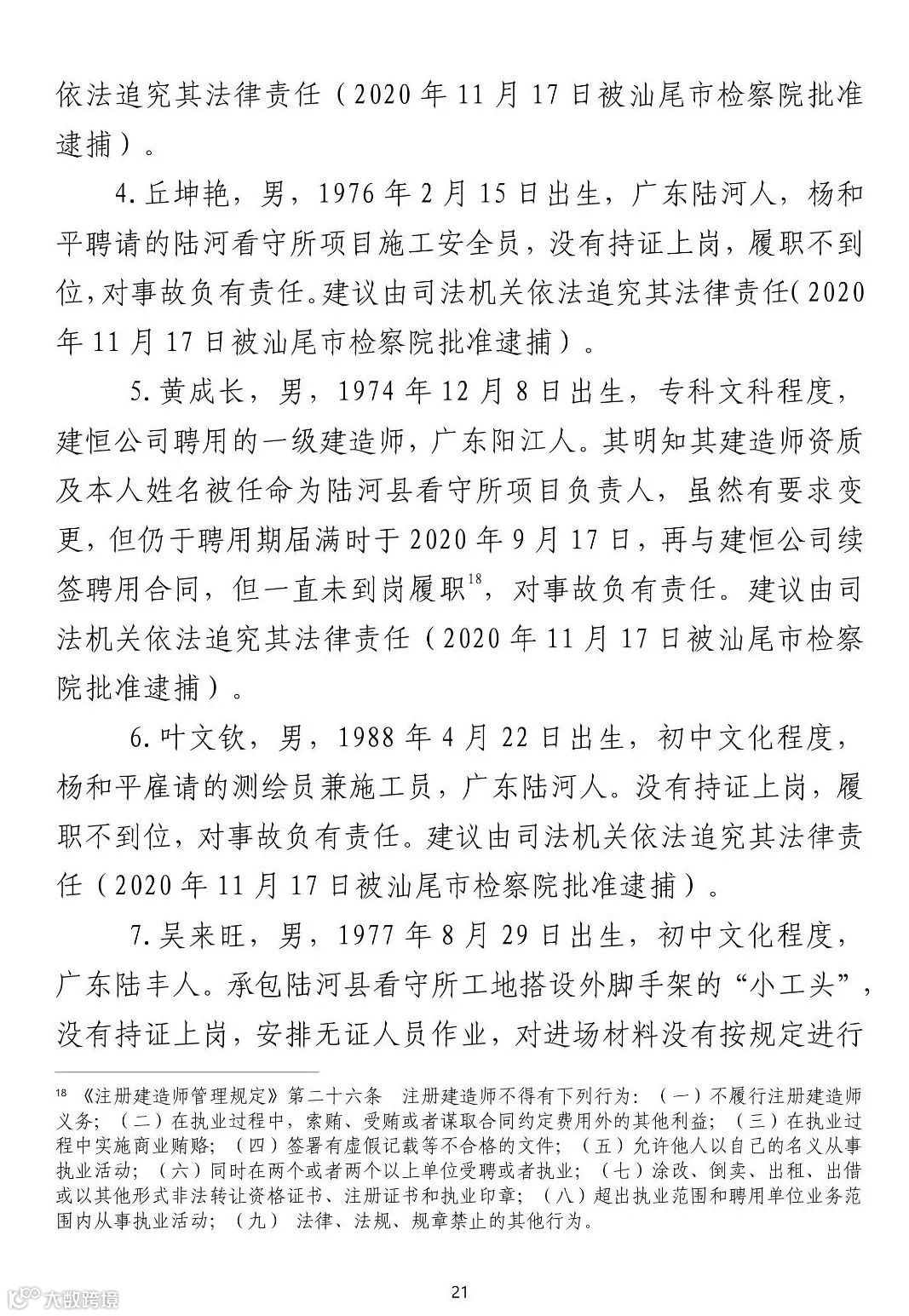 5.黄某长,男,专科文科程度,聘用的一级建造师,其明知其建造师资质及本人姓名被任命为陆河县看守所项目负责人,虽然有要求变更,但仍于聘用期届满时于2020年9月17日,再与施工单位续签聘用合同,但一直未到岗履职,对事故负有责任。建议由司 法机关依法追究其法律责任(2020 年11月17日被汕尾市检察院批准逮捕)。