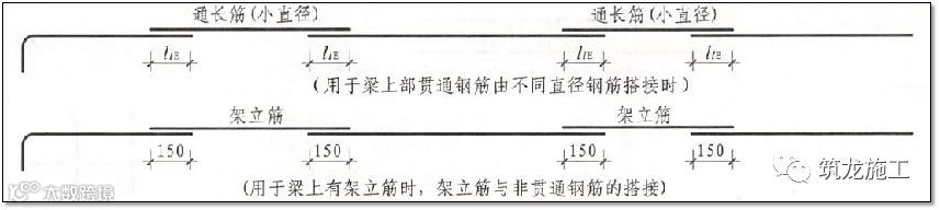梁上部不同直径通长筋搭接长度设置(16G101-1 P84)