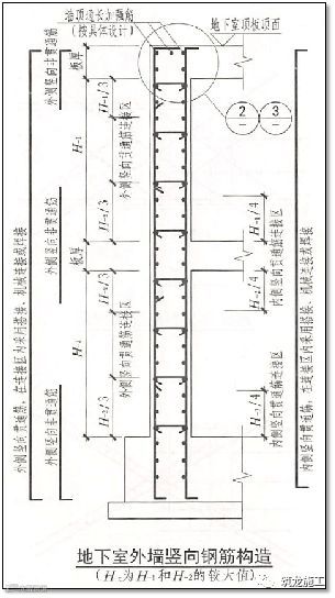 2、地下室外墙水平筋接头未设置在受力最小处。外墙外侧水平钢筋应位于跨中三分之一或墙高四分之一(二者取较小值)区域,外墙内侧应位于支座及支座附近(主要是有壁柱的地下室外墙)。