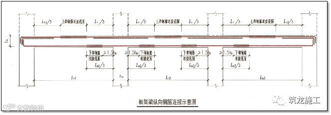 6、梁接头没有设置在受力较小处(上部纵筋为跨中三分之一区域),而是设在受力最大处,有的把梁上部钢筋设在梁支座处或附近。