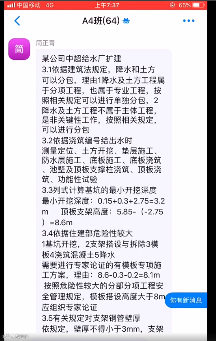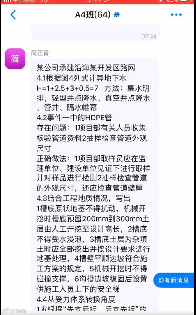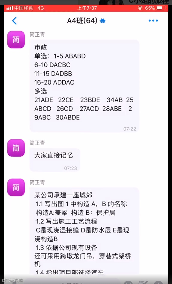 正观新闻记者从视频中了解到,上午7点23分,疑似二建市政试卷答案在一个有64人的群聊里面发布。发布答案的群成员还特意叮嘱考生:“大家直接记忆。”