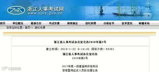 2018年1月22日,浙江人事考试网率先公布对2017一建雷同卷的处理公告,126名考生的考试成绩作废!