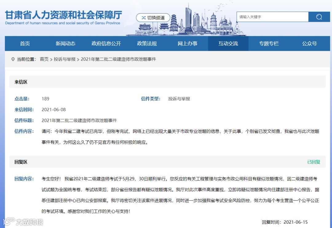 据甘肃省人力资源和社会保障厅网站消息,甘肃省人力资源和社会保障厅6月15日回复了一位网民关于“2021年第二批二级建造师市政泄题事件”的信件留言。