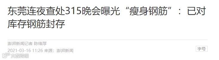此前,3月15日晚,央视“3·15”晚会曝光了“瘦身钢筋”的黑幕。废旧钢筋一夜翻新成“瘦身钢筋”,一年就有上万吨黑心钢筋流入工地。