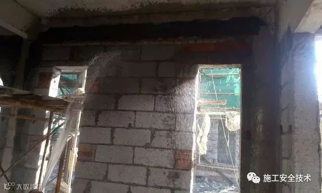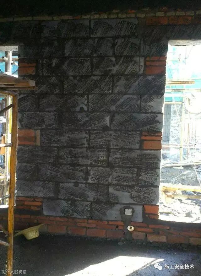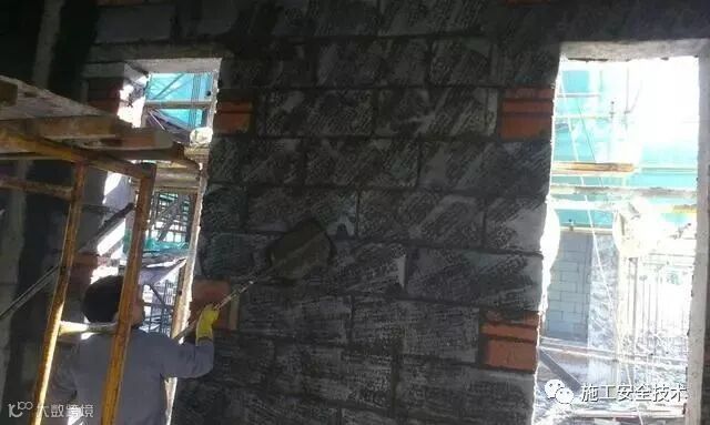 3、用自来水冲洗、湿润墙面。在喷浆前一天对墙面进行湿润,由于加气混凝土墙体吸水速度先快后慢,吸水量大而且延续时间长,故应增加湿润次数,使喷浆层有良好的凝结硬化条件,湿润标准以渗入加气混凝土块8~10mm为宜。