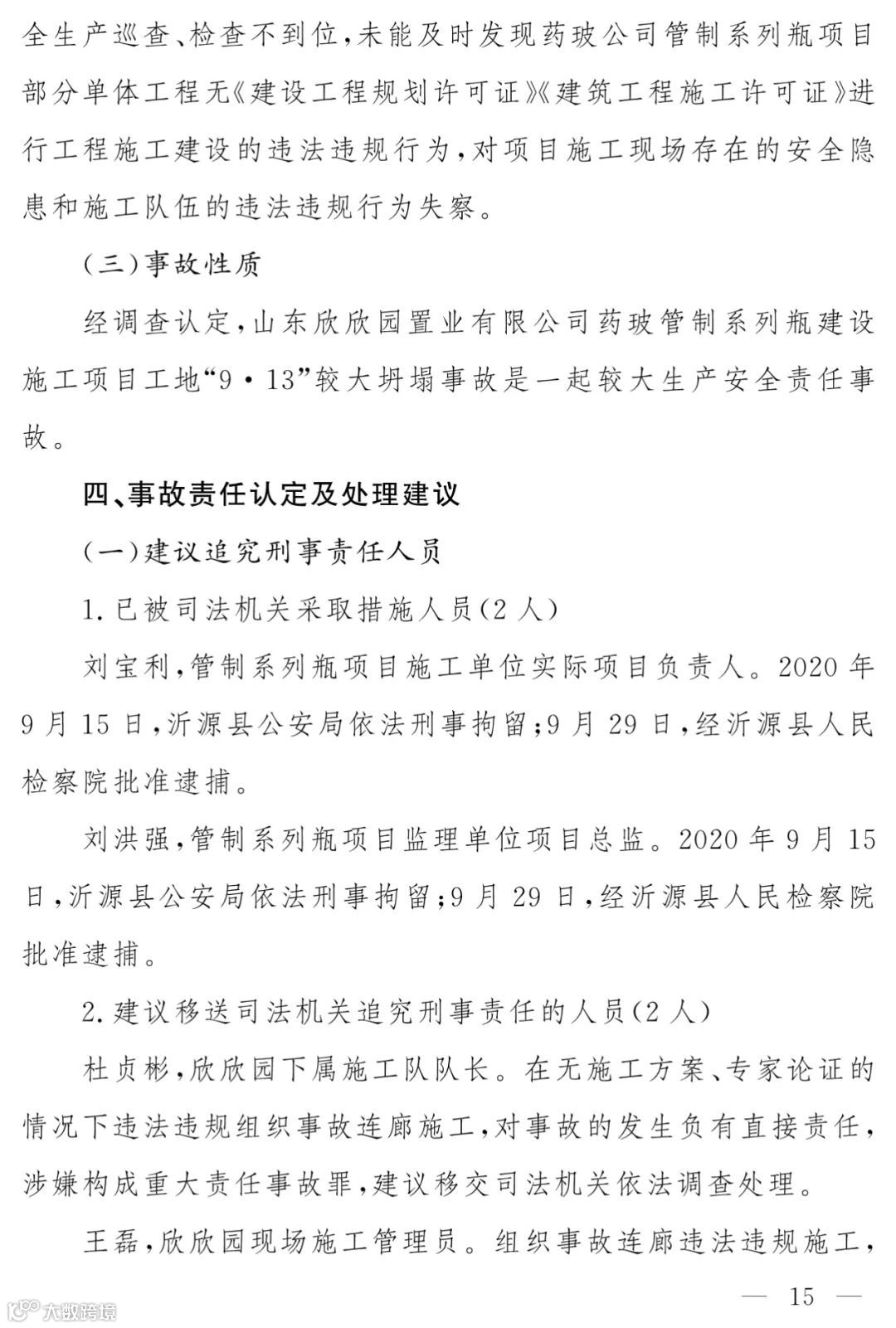 山东欣欣园置业有限公司药玻管制系列瓶建设项目施工工地“9·13”较大坍塌事故调查组报来的《山东欣欣园置业有限公司药玻管制系列瓶建设项目施工工地“9·13”较大坍塌事故调查报告》已经市政府研究,同意提出的事故责任认定、处理建议和防范措施。现批复给你们,请按照法定程序,对事故责任单位和人员依法作出处理,并报市应急局备案。