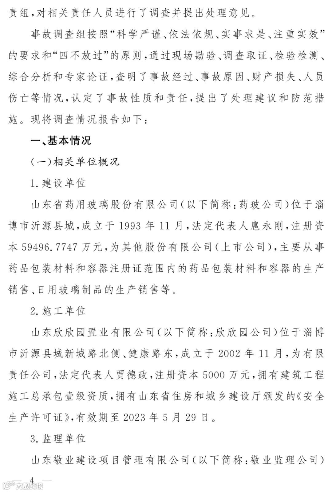 2020年9月13日18时4分,位于淄博市沂源经济开发区的山东欣欣园置业有限公司承建的药玻公司管制系列瓶建设项目施工工地发生一起坍塌事故,造成4人死亡、2人受伤,直接经济损失579万元。