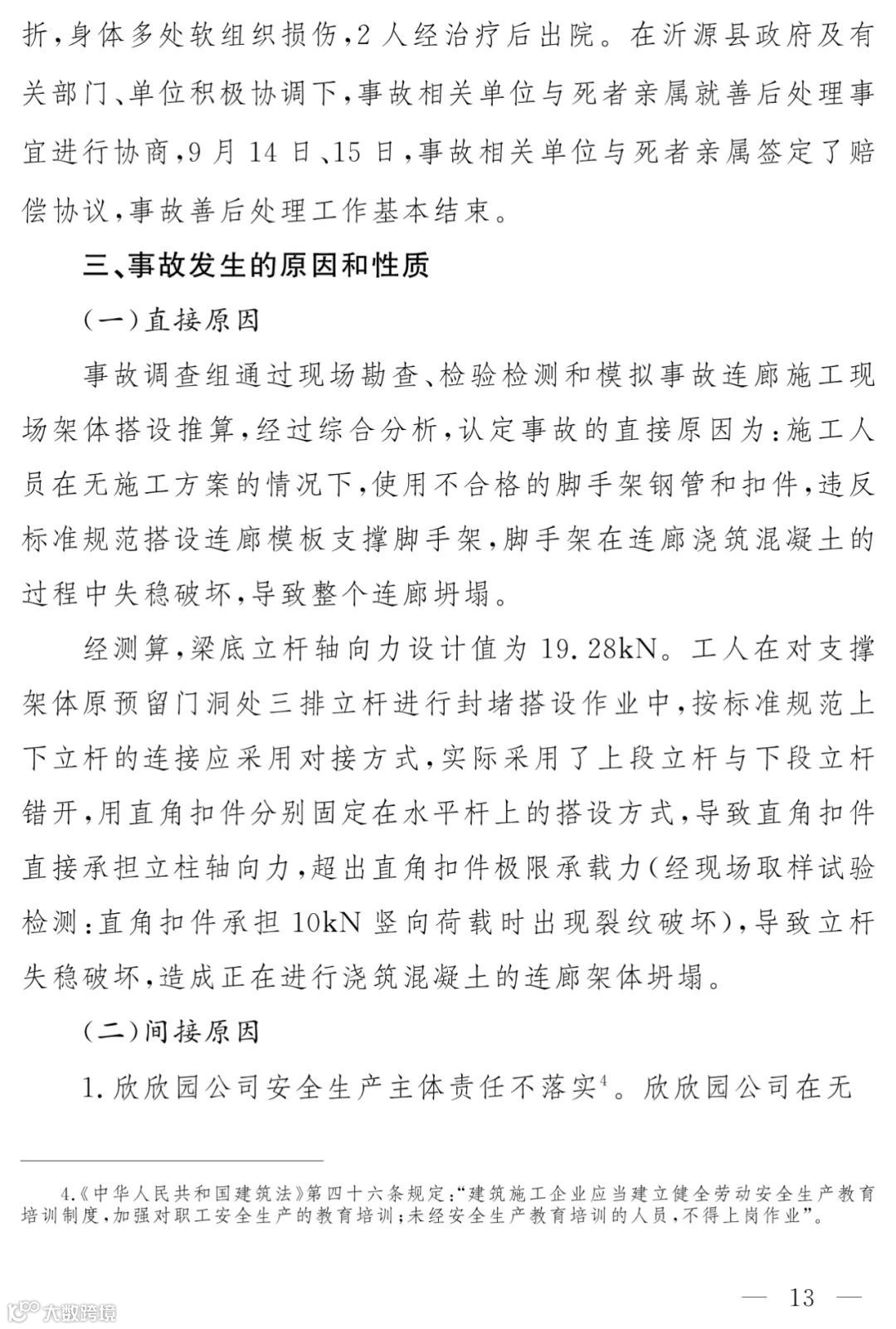 近期,淄博市政府批复了《山东欣欣园置业有限公司药玻管制系列瓶建设项目施工工地“9·13”较大坍塌事故调查报告》。因无施工方案,违规搭设连廊模板支撑脚手架,造成正在进行浇筑混凝土的连廊架体坍塌,致4死2伤。