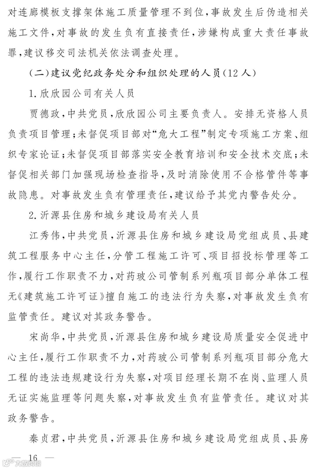 江某伟,中共党员,沂源县住房和城乡建设局党组成员、县建筑工程服务中心主任,对事故发生负有监管责任。建议对其政务警告。