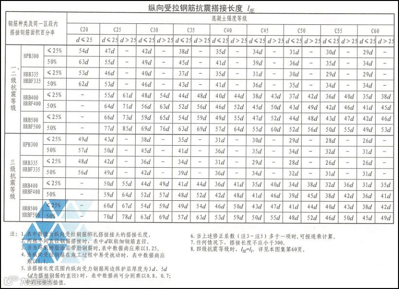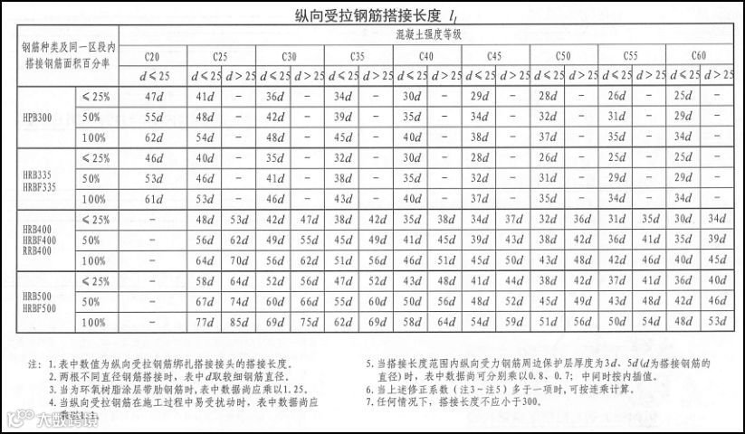 1).当带肋钢筋直径大于25mm时,其受拉钢筋的搭接长度应按表中值增加5d采用;当带肋钢筋直径d小于或等于25mm时,其受拉钢筋的搭接长度按表中值减少5d采用