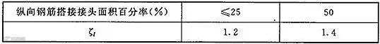 18.3.4 池壁环向钢筋搭接接头面积百分率不宜大于25%。其钢筋绑扎搭接长度应根据位于同一连接区段内的钢筋搭接接头面积百分率按下式计算: