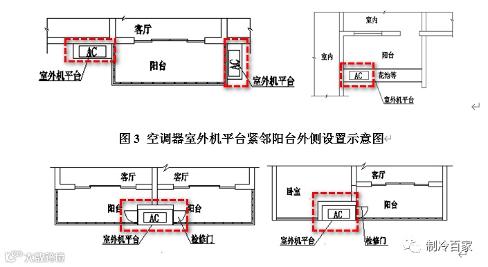 1、 空调器室外机平台宜紧邻阳台、窗洞口或检修门等便于从建筑内部直接就位安装的位置。