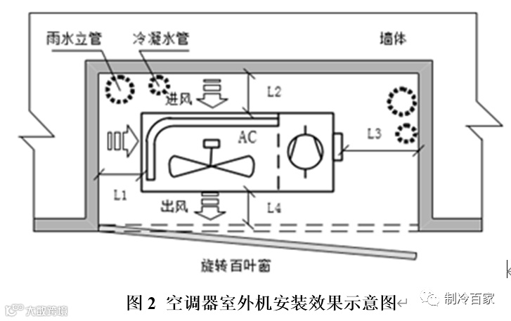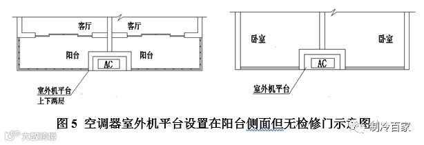 4 、空调器室外机平台与阳台、窗洞口或检修门之间不宜存在突出墙体或其他障碍物。
