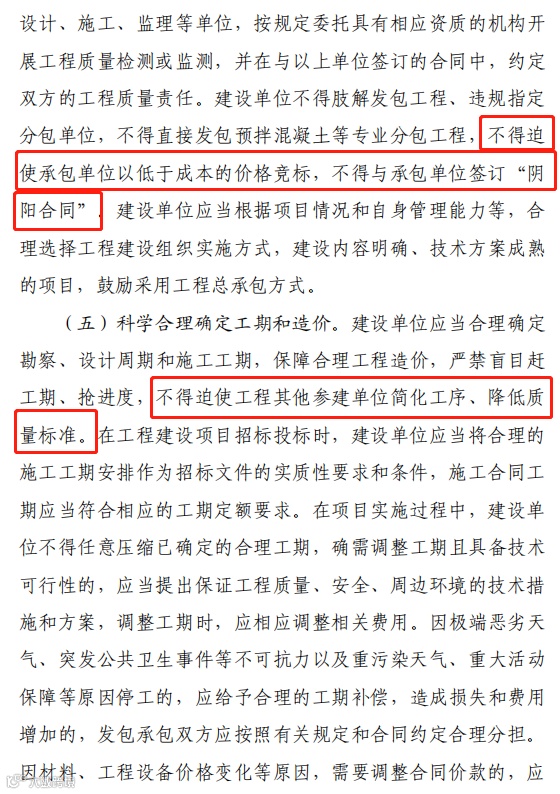 不得迫使承包单位以低于成本的价格竞标。不得与承包单位签订“阴阳合同”。