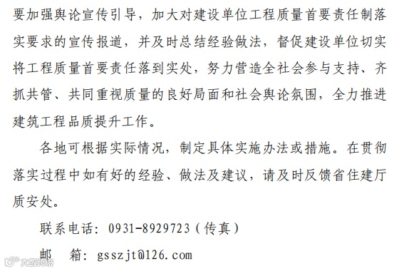 二、通过信函方式将意见寄至:兰州市城关区中央广场1号省住建厅质安处,并请在信封上注明“关于提升建筑品质落实建设单位工程质量首要责任公开征求意见”或传真至:0931-8929723