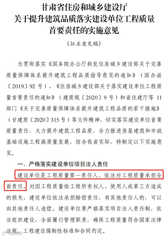 关于对《甘肃省住房和城乡建设厅关于提升建筑品质落实建设单位工程质量首要责任的实施意见(征求意见稿)》