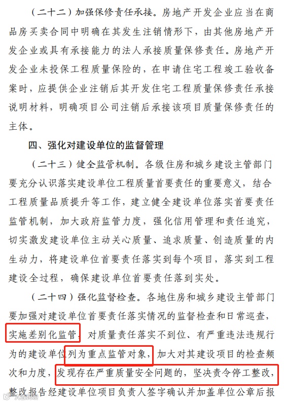 实施差别化监管。对质量责任落实不到位、有严重违法违规行为的建设单位列为重点监管对象,加大对其建设项目的检查频次和力度,发现存在严重质量安全问题的,坚决责令停工整改。