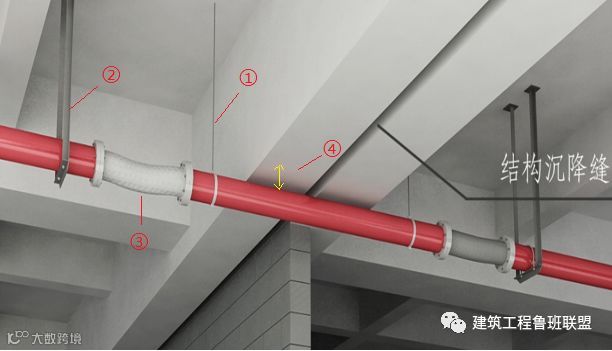 ①②:风管穿越变形缝一端(左)设置活动吊架,另外一端(右)设置风管固定吊架。