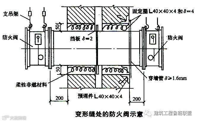 ③:风管穿越结构变形缝处应设置三防帆布柔性短管(消防风管采用防火帆布),其长度每边长出变形缝宽度100mm。负压风管要采用金属软接。