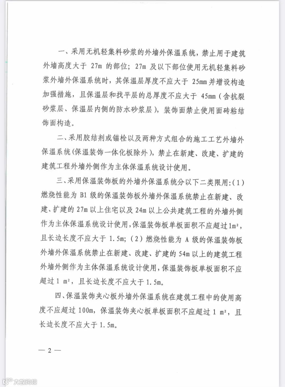 该规定限制使用无机轻集料砂浆和保温装饰一体化板等外墙外保温系统,禁止使用胶结剂或锚栓以及两种方式组合的外墙外保温系统施工工艺,禁止岩棉保温装饰板外墙外保温系统在新建、改建、扩建的建筑工程外墙外侧作为主体保温系统设计使用,禁止在中小学、托儿所、幼儿园、青少年宫和养老院二层及以上部位使用保温装饰一体化板,慎用挤塑聚苯板作为楼板保温构造材料。