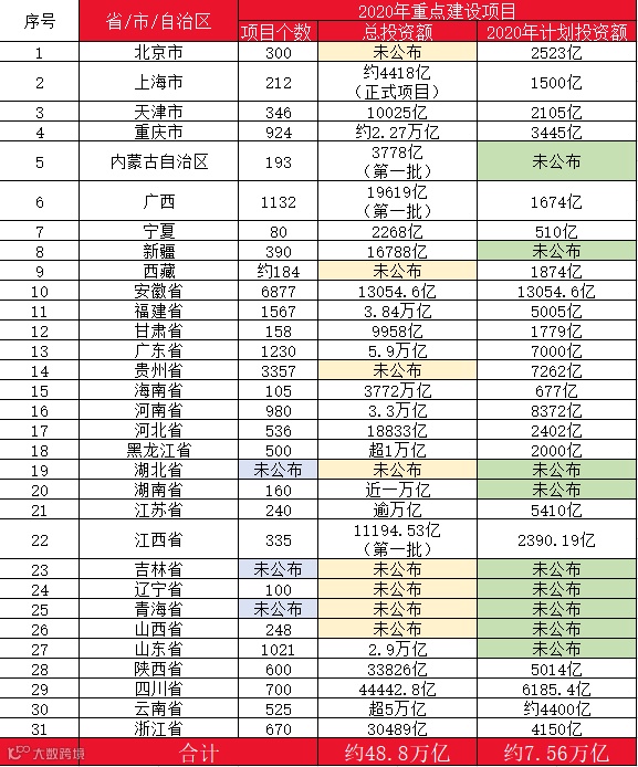 据相关数据统计,从目前有公布的各省2020年重点项目清单来看,总投资额约48万亿。加上未公布具体投资额的省区市,预计将达50万亿左右。当然这不是说今年就要全部投资到位的,而是未来3~5年内的总的一个投资蓝图。