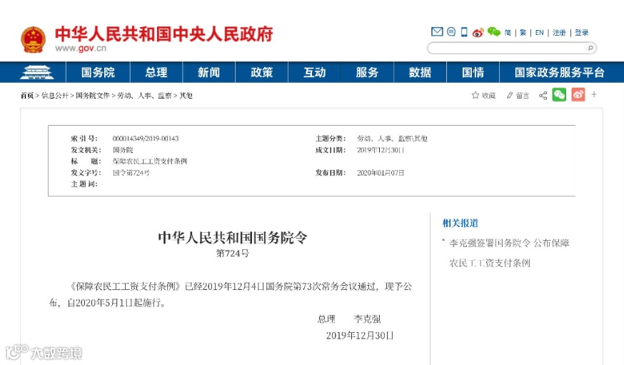 2019年12月30日,国务院总理李克强签署第724号国务院令,公布《保障农民工工资支付条例》。其中,就包括缴纳农民工工资保证金一项。