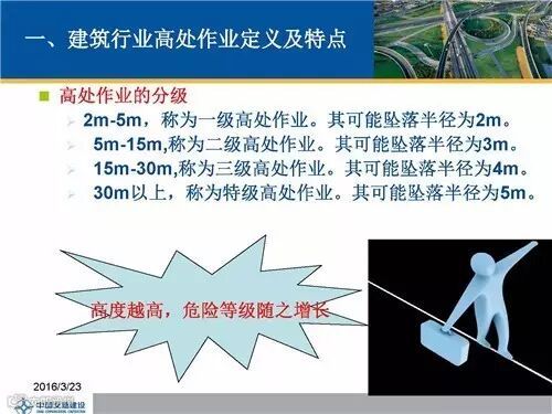 在国家标准GB/T3608-2008《高处作业分级》中有明确规定:“凡在坠落高度基准面2m以上(含2m)有可能坠落的高处进行的作业称为高处作业。”