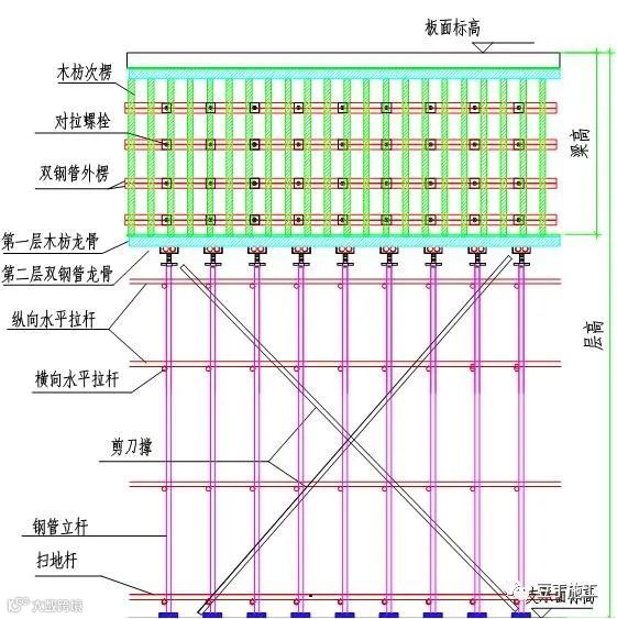 2)架体构造措施:所有满堂支撑架体四周搭设连续竖向剪刀撑,支撑体系内部每隔4.5m搭设竖向和水平向剪刀撑。水平剪刀撑设置在架体底部扫地杆位置一道、梁底下第一步水平杆位置一道,层高较高的楼层中间设置一道,在架体中间水平杆位置满铺一道水平安全兜网。
