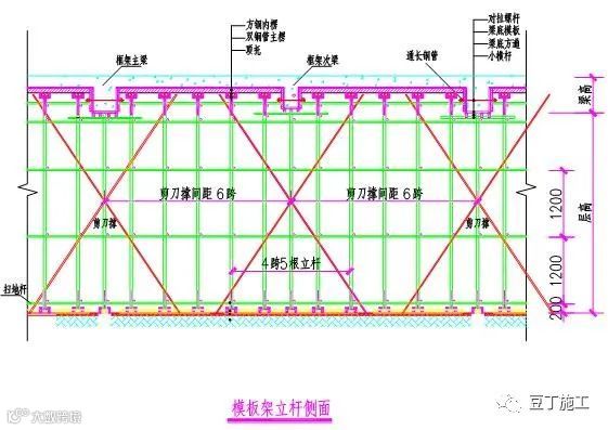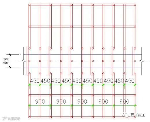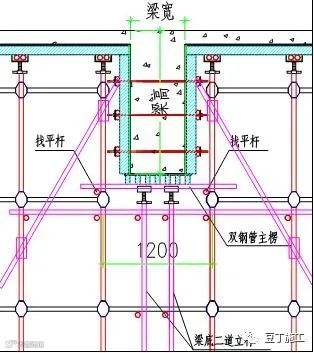 统一采用梁底增设一根立杆的搭设方式,梁宽方向间距(250+梁宽+250)根据梁宽尺寸进行调整,选用900、1200两种间距。沿梁跨方向立杆间距匹配满堂架立杆间距,间距450mm。两侧布置2~4排对拉螺杆。